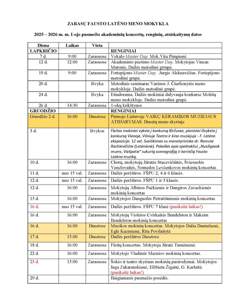 2025 – 2026 m. m. I-ojo pusmečio akademinių koncertų, renginių, atsiskaitymų datos
