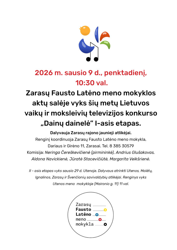 2026 m. sausio 9 d., penktadienį, 10:30 val. Zarasų Fausto Latėno meno mokyklos aktų salėje vyks šių metų Lietuvos vaikų ir moksleivių televizijos konkurso „Dainų dainelė” I-asis etapas. Dalyvauja Zarasų rajono jaunieji atlikėjai. SĖKMĖS visiems! Renginį koordinuoja Zarasų Fausto Latėno meno mokykla. Komisija: Neringa Čereškevičienė (pirmininkė), Andrius Glušakovas, Aldona Navickienė, Jūratė Stacevičiūtė, Margarita Veikšrienė. II – asis etapas vyks sausio 29 d. Utenoje. Dalyvaus atrinkti Utenos, Molėtų, Ignalinos, Zarasų ir Švenčionių savivaldybių atlikėjai.