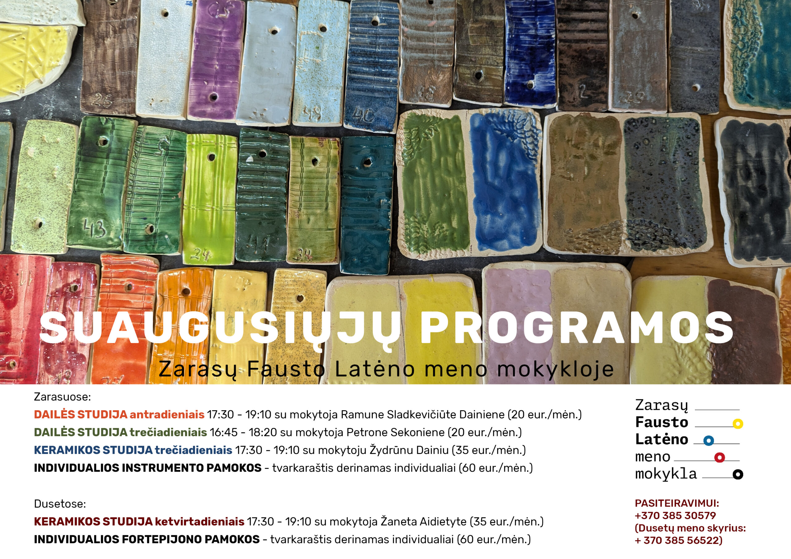 Dusetų meno skyriuje keramikos užsiėmimai suaugusiems vyksta ketvirtadieniais nuo 17:25, mokytoja Žaneta Aidietytė.